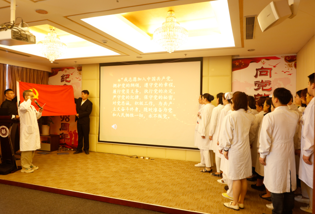“我志愿加入中国共产党,拥护党的纲领,遵守党的章程,履行党员义务,执行党的决定,严守党的纪律.......”院党委王海鹰同志领誓,医院党政...